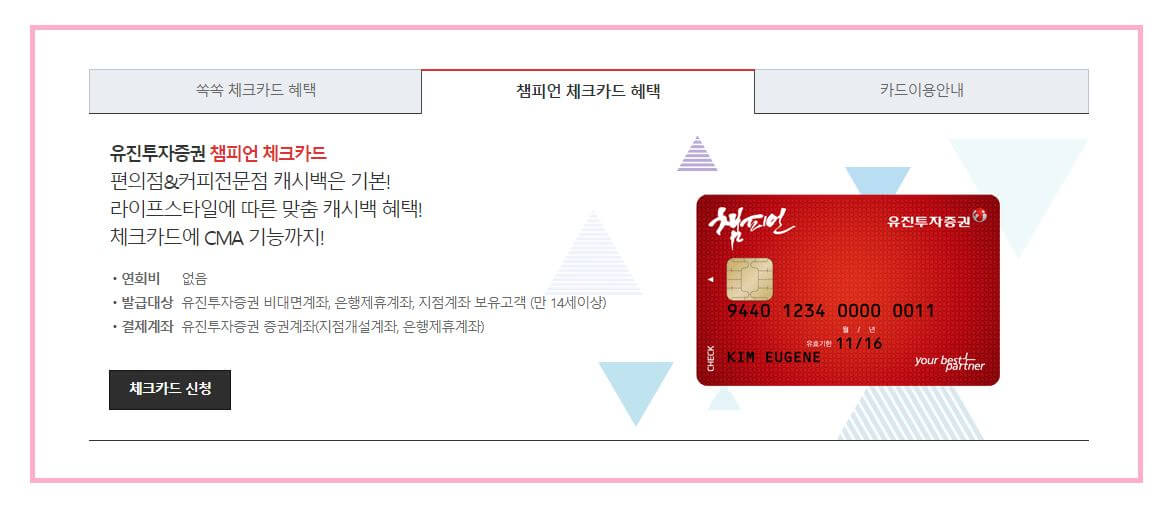 첫번째로 소개해 드릴 체크카드는 유진투자증권의 챔피언 체크카드 입니다. 유진투자증권의 챔피언 체크카드는 편의점, 커피전문점에 대한 기본 캐쉬백 혜택에 주유, 온라인쇼핑, 오프라인쇼핑등의 선택형 혜택이 있는 체크카드 입니다. 선택형 혜택은 주유, 온라인쇼핑, 오프라인쇼핑 3가지중 하나 선택 가능합니다. 신용카드가 아니라 체크카드 이기 때문에 연회비는 없구요. 만 14세이상의 유진투자증권의 비대면계좌, 은행제휴계좌 등의 지점계좌를 가지고있거나 발급받을 분에게 발급대상이 됩니다.