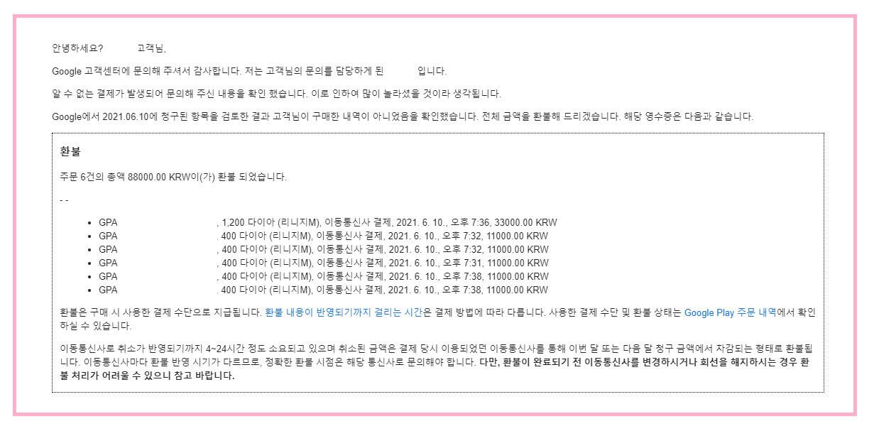 2021년 6월 10일 114앞으로 메세지가 다량 수신되었습니다. 수신된 내역은 구글플레이 리니지M 게임의 다이아 구매 11000원 결제에서 33000원결제까지 한회도 아닌 6회에 걸쳐 88000원이 결제되었다는 문자였습니다. 무슨일인가 싶어 온라인에 알아보니 저 말고도 이따른 구글플레이 소액결제 사기를 당하신분들이 엄청 많으시더라구요. 작게는 10만원 크게는 100만원 이상까지 피해를 보신분들이 있는데요