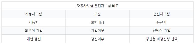 자동차보험은 내가 자동차를 구입하였을 때 의무적으로 반드시 가입하여야하는 의무적인 보험이구요. 운전자보험은 선택적 보험으로 내가 운전을하면서 운전자보험을 가입하여도 되고 하지 않아도 되는 선택적 보험입니다. 자동차보험과 운전자보험의 큰 특징은 자동차보험은 보험을 매년 갱신하여야 하여야 하는 것에 비해 운전자보험은 가입시 갱신형/비갱신형으로 선택적으로 가입이 가능합니다.