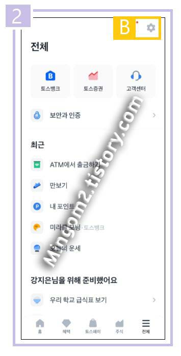 토스뱅크 회원탈퇴 신청을 위해 토스뱅크 앱(App) 실행 후 하단에 "전체(메뉴)"를 클릭하고 이번에는 상단의 "톱니바퀴 아이콘"을 클릭하여 설정 메뉴로 이동하여 줍니다.