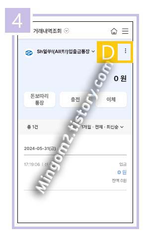 파트너뱅크 앱의 전체계좌조회 메뉴로 이동해주셨다면 수협은행 탭에 해지하고자 하는 계좌를 입출금, 예적금/신탁, 대출 등을 구분하여 선택하여 주세요. 계좌화면을 클릭하면 거래내역 조회 메뉴로 이동하며 “더 보기(삼점 아이콘)를 클릭하여 주세요.