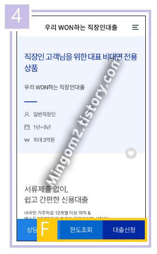 우리WON뱅크 신용대출 상품 가입 메뉴로 이동해주셨다면 스크롤을 아래로 내려 “직장인”을 선택하고 우리은행 마이너스통장에 해당하는 “우리WON하는 직장인대출” 상품을 찾아 “한도조회” 또는”대출신청“을 통해 마이너스통장 개설 절차를 시작합니다.