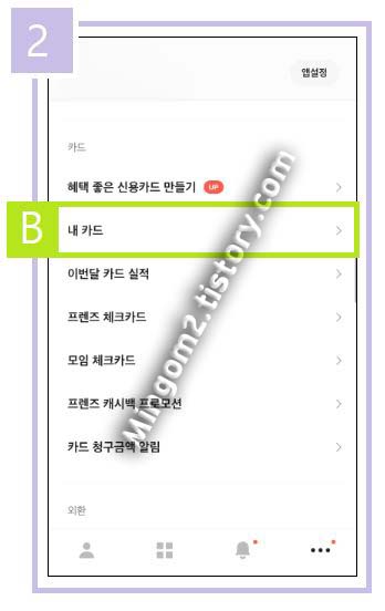 카카오뱅크 앱을 실행하여 주세요. 해당 서비스는 회원가입 및 로그인이 필요한 작업입니다. 카카오뱅크 앱 실행 및 로그인 후 우측 하단에 “더 보기(삼점 아이콘)“를 클릭하고 스크롤을 아래로 내려 카드 항목에 “내 카드” 경로를 찾아 이동하여 주시기 바랍니다.