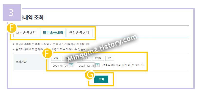 하나은행 송금내역 조회 메뉴로 이동해주셨다면 먼저 “받은송금내역”을 클릭하고 조회기간에 달력 아이콘을 클릭하여 외화송금 내역을 적용할 기간을 직접 설정하여 주신 다음 “조회”를 클릭하여 줍니다.