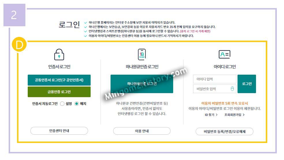기본적으로 하나은행 홈페이지를 통해 금융 업무를 이용하기 위해서는 공동인증서 또는 금융인증서가 필요합니다. 인증서가 없는 분들은 하나은행 어플(하나원큐인증로그인)을 통해 인증하여 로그인하시거나 아이디를 통해 로그인하는 방법도 있습니다.