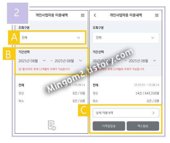 ※경로 : KB Pay 앱 - 전체메뉴 - 개인사업자 - 개인사업자용 이용내역
