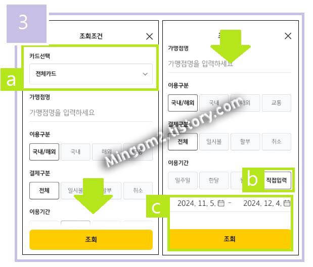 ※경로 : 카드선택 - 이용구분 - 결제구분 - 이용기간 - 조회